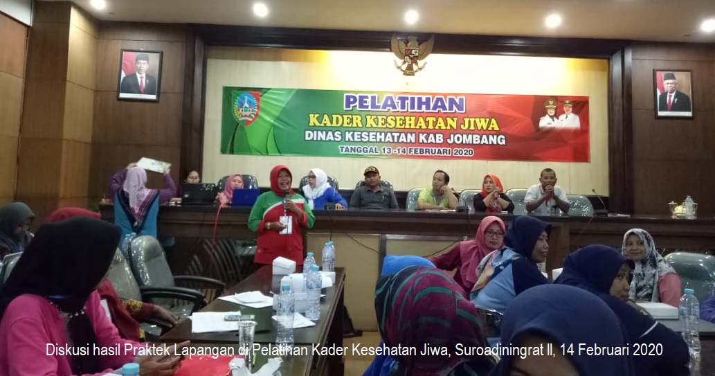 Pelatihan Kader Kesehatan Jiwa di Ruang Suroadiningrat 2 Lingkup Pemkab Jombang yang dilakukan Kamis–Jum’at (13/02–14/02) selain bertujuan untuk meningkatkan pengetahuan dan ketrampilan kader kesehatan jiwa, juga bertujuan untuk memantapkan keberadaan Kader Posyandu Jiwa (KKJ) dalam membantu Tenaga Puskesmas dalam memberikan pelayanan kesehatan Jiwa di Posyandu Jiwa. Kegiatan pelatihan kader ini dilaksanakan selama 2 (dua) hari menggunakan biaya dari DPA APBD Dinas Kesehatan Kabupaten Jombang Tahun 2020. Kegiatan Pelatihan ini diikuti oleh 68 kader kesehatan jiwa yang berasal dari 34 Puskesmas se Kabupaten Jombang masing-masing diwakili 2 orang.