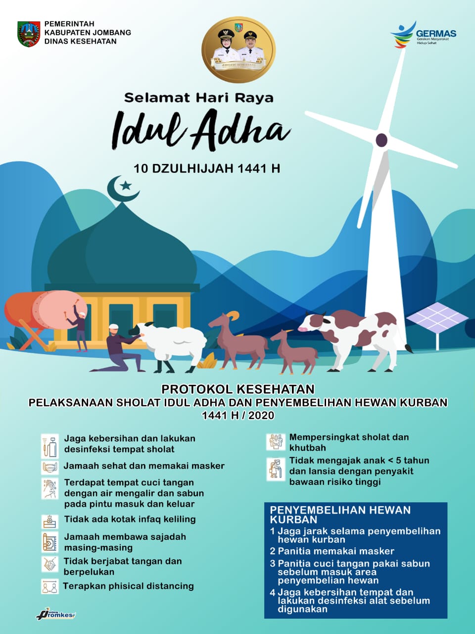 Jombangkab.go.id-Dinkes, Menyambut datangnya hari raya Idul Adha, kami keluarga besar Dinas Kesehatan Kabupaten Jombang mengucapkan selamat hari raya Idul Adha 1441H, sekaligus mengajak kepada masyarakat di Kabupaten Jombang untuk menerapkan protokol kesehatan dalam pelaksanaan sholat Idul Adha dan penyembelihan hewan qurban. Semoga Alloh SWT senantiasa memberikan kesehatan kepada kita semua. Aamiin.