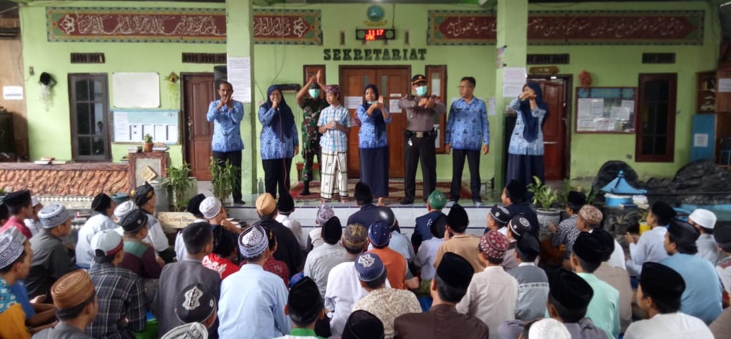 Jombangkab-Dinkes, Sosialisasi covid-19 disampaikan olehKepala Pkm Mayangan dr. Dyah Ayu Yulyastuti bersama Kapolsek, Danramil, Sekcam Kecamatan Jogoroto pagi jam 10.00 dihari Selasa 17-3-2020 bertempat pondok pesantren Hamalatul Quran Jogoroto, Jombang. dr. Dyah Ayu Yulyastuti menyarankan agar masyarakat untuk tidak panik akan berita tentang corona, dengan hidup sehat dapat dipastikan tidak akan terkena virus corona.Diharapkan pada msyarakat yang mengalami batuk pilek panas serta nyeri tenggorokan agar segera periksa ke Puskemas agar segera mendapatkan pengobatan. Upayakan untuk selalu menjaga kebersihan diri minimal dengan cuci tangan dan memakai APD (Alat PelindungDiri) berupa masker bl sakit. Cara cuci tangan sangat sederhana dengan menggunakan sabun & air mengalir/hand sanitizer, gunakan 6 langkah mudah. Pada kesempatan ini juga diperagakan cara cuci tangan 6 langkah, Cara pakai masker & Etika batuk yg benar didepan para santri & bu Nyai.
