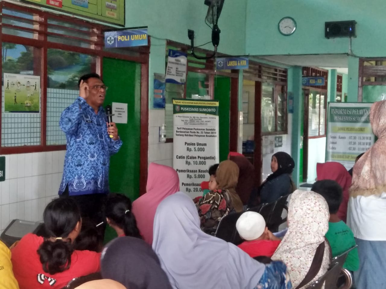 Jombangkab-Dinkes, Pada hari Selasa dan Rabu, 17-18 Maret 2020 Petugas kesehatan Puskesmas Sumobito melaksanakan sosialisasi dalam rangka memberikan informasi akurat mengenai pencegahan penyebaran Covid-19 atau Corona Virus. Bertempat di ruang tunggu Puskesmas, kegiatan ini mengambil sasaran seluruh masyarakat yang melakukan aktifitas di lingkungan puskesmas. Kepala puskesmas Sumobito, dr. Hexawan Tjahja Widada, M.KP mengatakan tujuan kegiatan untuk meningkatkan upaya pencegahan penyebaran virus Corona, khususnya di wilayah kerja Puskesms Sumobito. Kepala puskesmas menambahkan, tanda dan gejala Covid-19 antara lain suhu tubuh diatas normal, kemudian batuk berlendir atau batuk kering, sulit bernafas sampai sesak serta nyeri tenggorokan. Karenanya selaku petugas kesehatan, perlunya disampaikan upaya pencegahan yang dapat dilakukan masyarakat. “Upaya pencegahan dilakukan dengan sering cuci tangan menggunakan sabun dan air mengalir, bisa juga dengan antiseptik, menjaga perilaku hidup bersih dan sehat (PHBS), makan makanan bergizi, serta olahraga teratur”, dirinya menghimbau agar masyarakat pro aktif datang ke fasilitas kesehatan apabila ada tanda gejala diatas, utamanya pada masyarakat yang memiliki riwayat kunjungan 14 hari terakhir dari negara-negara yang positif terjangkit virus Covid-19 atau disebut Pasien Dalam Pengawasan (PDP). Kemudian Orang Dalam Pementauan (ODP) yaitu orang yang mengalami gejala tanpa Pneumonia dan melakukan perjalanan ke negara terjangkit sebelum timbul gejala.