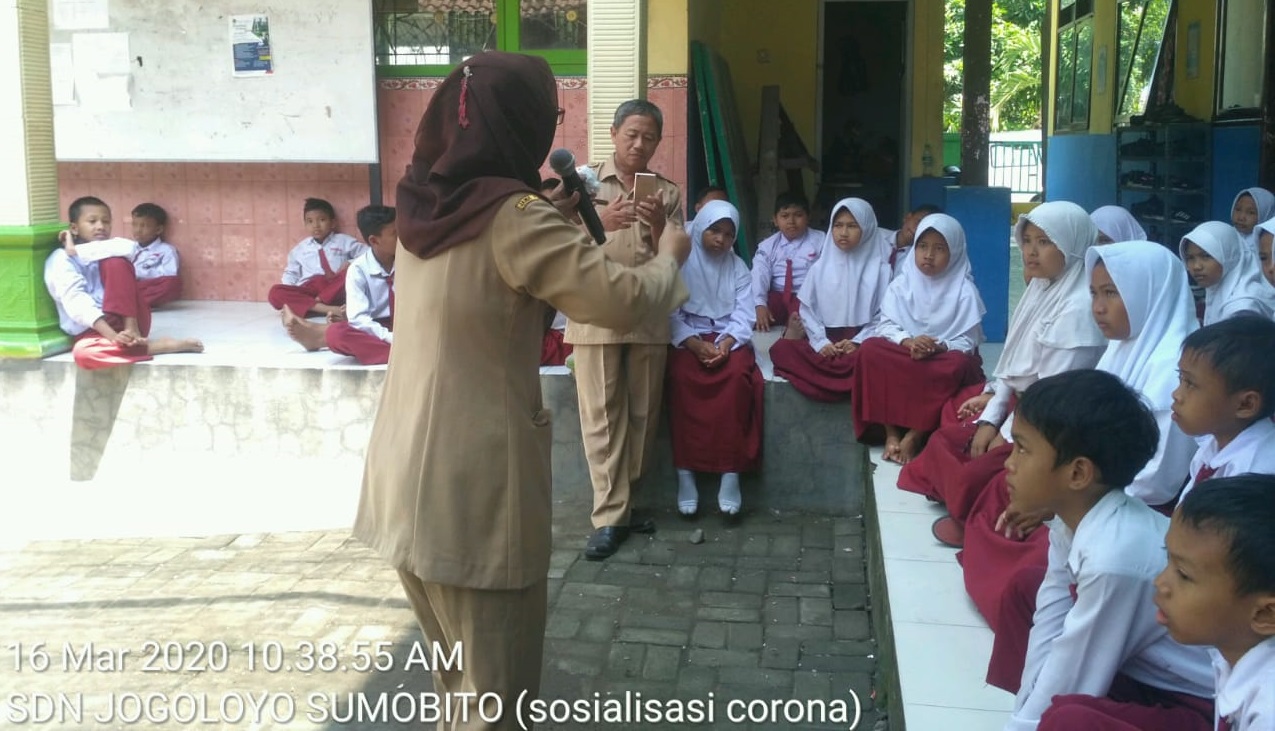 Jombangkab-Dinkes, Sosialisasi covid-19 di SDN Jogoloyo wilker Puskesmas Jogoloyo yang disampaikan oleh Kepala Puskesmas Jogoloyo Rizkie Joerniawati, SKM, beserta tenaga sanitarian, pada murid dan guru sekolah pada hari Senin, 16 Maret 2020 jam 10.00. Hal ini sekaligus menindaklanjuti persiapan kegiatan belajar di rumah. Dihimbau kepada murid untuk membatasi kegiatan di luar rumah, menjaga kebersihan, kesehatan serta tetap menjalankan tugas2 yang diberikan oleh sekolah.