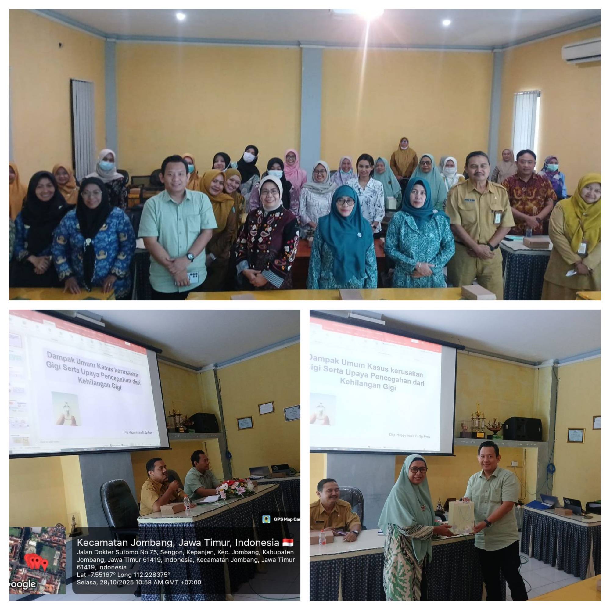 Perawatan gigi dan mulut adalah usaha untuk menjaga kesehatan gigi, gusi, dan rongga mulut agar tetap bersih dan berfungsi baik, serta mencegah berbagai masalah seperti gigi berlubang, penyakit gusi, dan bau mulut. Perawatan ini melibatkan kebiasaan sehari-hari seperti menyikat gigi dan flossing, serta kunjungan rutin ke dokter gigi. Selanjutnya disampaikan juga kesehatan gigi dan mulut merupakan cerminan terhadap kesehatan diri kita, permasalahan di dalam rongga mulut sangat memengaruhi kesehatan tubuh, jika kesehatan gigi dan mulut tidak dijaga, risiko terhadap penyakit atau masalah kesehatan lainnya akan meningkat. kata Happy Indra Bakhti, drg, Sp.Pros dari RSUD Ploso Jombang sebagai narasumber pertemuan Pentingnya Perawatan Kesehatan Gigi dan Mulut, Selasa (28/10) di Ruang Sehat 1 Dinas Kesehatan Kabupaten Jombang.