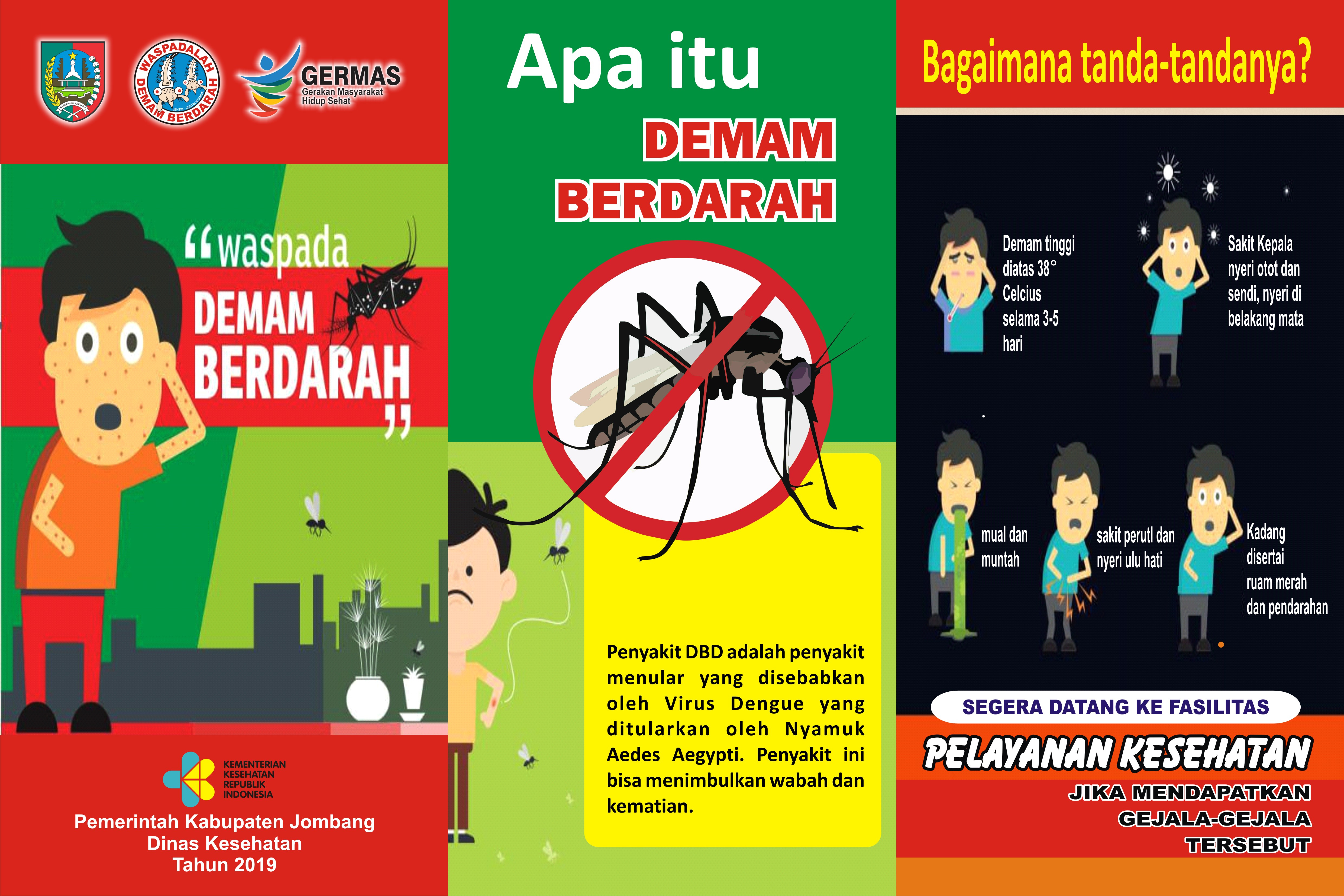 Kementerian Kesehatan Republik Indonesia2/231-12-2019tangan dan kaki dingin berkeringat, nyeri ulu hati, dan muntah. Dapat pula disertai pendarahan seperti mimisan dan buang air besar bercampur darah sertaturunnya jumlah trombosit hingga 100.000/mm3. Tidak perlu menunggu semua gejala ini muncul, bila menemukan beberapa tanda segera periksakan ke dokteratau sarana kesehatan terdekat.Pertolongan pertama pada penderita dapat dilakukan dengan memberikan minum sebanyak-banyaknya (air masak, air dalam kemasan, air teh, dsb),mengompreskan air dingin pada penderita, serta memberikan obat penurun panas. Bila ada riwayat kejang, berikan obat anti kejang.Berita ini disiarkan oleh Pusat Komunikasi Publik, Sekretariat Jenderal Departemen Kesehatan. (www.depkes.go.id)