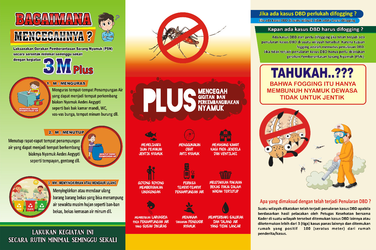 Musim hujan telah tiba, masyarakat diminta waspada terhadap Demam Berdarah Dengue. Untuk mengindari penyakit yang belum ada obat maupun vaksinnya ini,masyarakat diminta menjaga kebersihan lingkungan, melakukan pemberantasan jentik nyamuk dengan 3M Plus (mengubur, menguras dan menutup plus hindarigigitan nyamuk).Demikian pesan Dirjen Pengendalian Penyakit dan Penyehatan Lingkungan Depkes Prof. Dr. Tjandra Yoga Aditama berkaitan peningkatan kasus DBD diberbagai daerah serta datangnya musim hujan di Jakarta, 4 Desember 2009.Menurut Dirjen P2PL, sejak Januari Oktober 2009, Demam Berdarah Dengue (DBD) telah menelan 1.013 korban jiwa dari total penderita sebanyak 121.423 orang(CFR: 0,83). Jumlah ini meningkat dibandingkan periode tahun 2008 yaitu 953 orang meninggal dari 117.830 kasus (CFR: 0,81). Jangan tunggu jatuh banyakkorban lagi, lakukan 3 M Plus secara bersama-sama.Dari kasus yang dilaporkan selama tahun 2009, tercatat 10 provinsi yang menunjukkan kasus terbanyak, yaitu Jawa Barat (29.334 kasus 244 meninggal), DKIJakarta (26.326 kasus 33 meninggal), Jawa Timur (15.362 kasus 147 meninggal), Jawa Tengah (15.328 kasus, 202 meninggal), Kalimantan Barat (5.619 kasus,114 meninggal), Bali (5.334 kasus, 8 meninggal), Banten (3.527 kasus, 50 meninggal), Kalimantan Timur (2.758 kasus, 34 meninggal), Sumatera Utara (2.299kasus, 31 meninggal), dan Sulawesi Selatan (2.296 kasus, 20 meninggal), ujar Prof. Tjandra.Beberapa provinsi yang mengalami peningkatan kasus dibandingakan tahun 2008 adalah Jambi, Bangka Belitung, Banten, DKI Jakarta, Jawa Barat, Jawa Timur,Kalimantan Barat, Sulawesi Barat dan Papua.Korban akibat DDB diperkirakan terus bertambah terutama pasca banjir, pergantian musim, dan pada waktu curah hujan jarang terjadi dimana banyakpenampungan air seperti vas bunga, tendon air/ water toren, bak mandi, tempayan serta ban bekas, kaleng bekas, botol minuman bekas dan sebagainya yangdekat dengan lingkungan pemukiman penduduk tidak dibersihkan, sehingga menjadi tempat perindukan nyamuk Aedes Aegypti penular DBD.Nyamuk ini juga menularkan penyakit Chikungunya yang menyerang otot-otot dan menimbulkan nyeri berat. Menggigit pada siang hari dengan waku efektif 2 jamsetelah matahari terbit (pukul 08.00 12.00 dan beberapa jam setelah matahari tenggelam (pukul 15.00 17.00). Setelah digigit nyamuk, antara 3 14 hari kemudianatau biasanya 4 7 hari akan menunjukkan gejala atau tanda-tanda DBD. Penyakit ini dapat dicegah dengan menghindari gigitan nyamuk Aedes Aegypti, yaitumenggunakan obat nyamuk oles (repellent), menggunakan kelambu bila tidur siang, dan usir nyamuk dengan obat nyamuk bakar/ semprot baik di dalam maupundi luar rumah pada pagi dan sore hari.Tanda atau gejala DBD yang muncul seperti bintik-bintik merah pada kulit. Selain itu suhu badan lebih dari 38OC, badan terasa lemah dan lesu, gelisah, ujung1